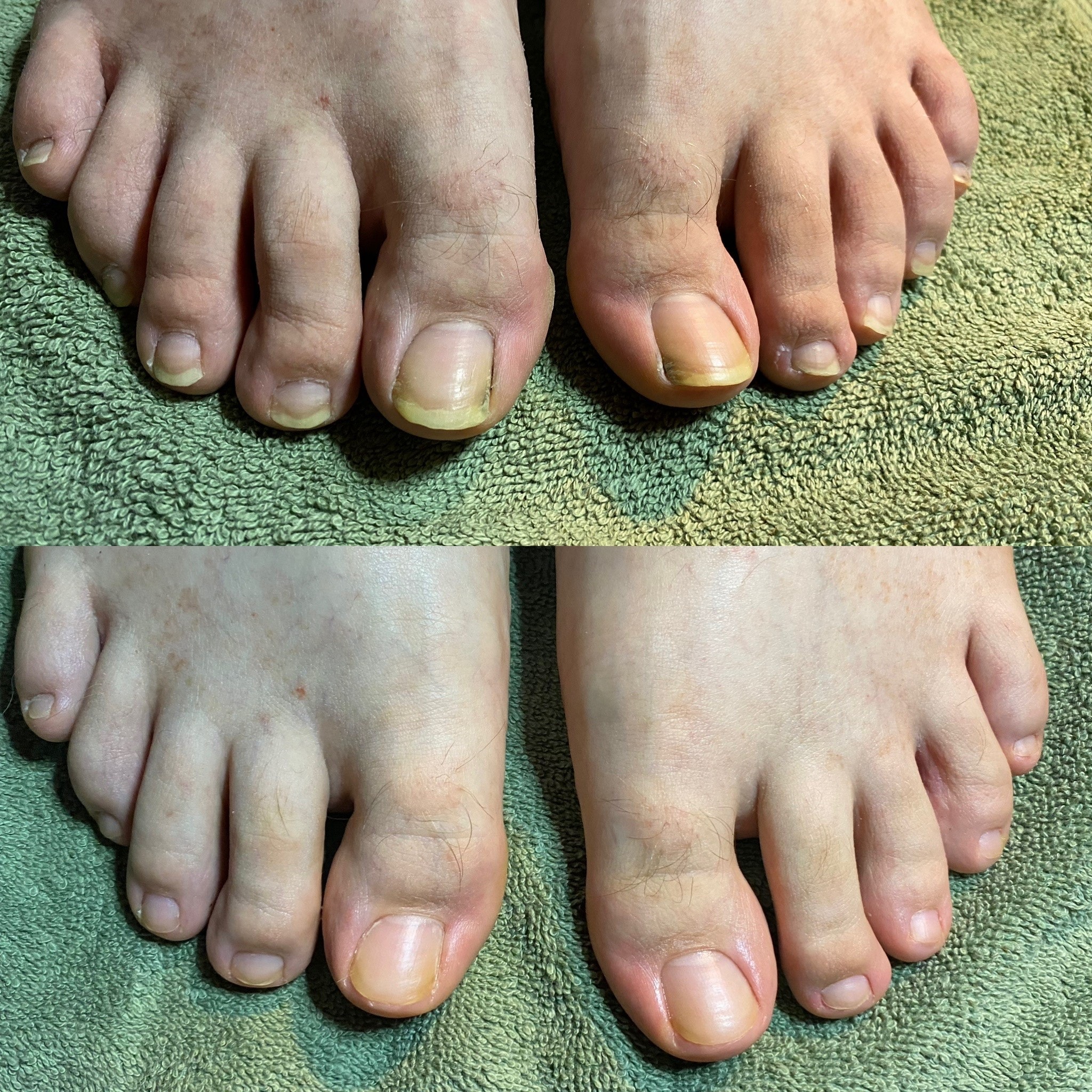 Samme sæt fødder, men før og efter en fodplejebehandling.