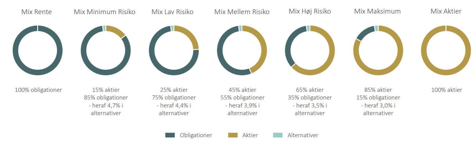 Du kan vælge mellem syv mix af obligationer og aktier – lige fra 100 procent obligationer til 100 procent aktier. De syv Mix-afdelinger er kendetegnet ved, at de hovedsageligt investerer i obligationer og aktier via andre investeringsforeningsafdelinger, og hver især er tilpasset forskellige opsparingsbehov.Legal disclaimer